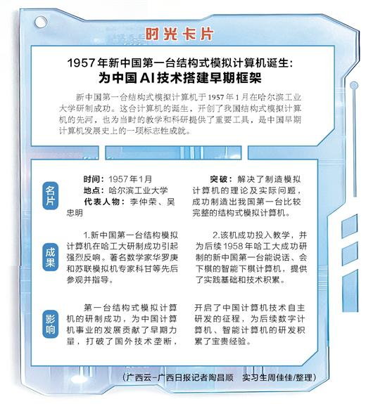 新中国第一台结构式模拟计算机于1957年1月在哈尔滨工业大学研制成功。这台计算机的诞生,开创了我国结构式模拟计算机的先河,也为当时的教学和科研提供了重要工具,是中国早期计算机发展史上的一项标志性成就。