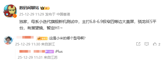 【CNMO科技消息】12月29日,数码博主@数码闲聊站 爆料称,有款小迭代旗舰新机正在测试,主打6.8英寸到6.9英寸的极窄四等边大直屏,搭载第五代骁龙8至尊版移动平台大额股票配资,后置摄像组合有潜望式镜头,暂定于明年上半年发布。结合评论区信息来看,该机可能为小米17 Plus。评论区还提到,小米17 Plus将不会有背屏,目前暂无更多关于该机的相关爆料。